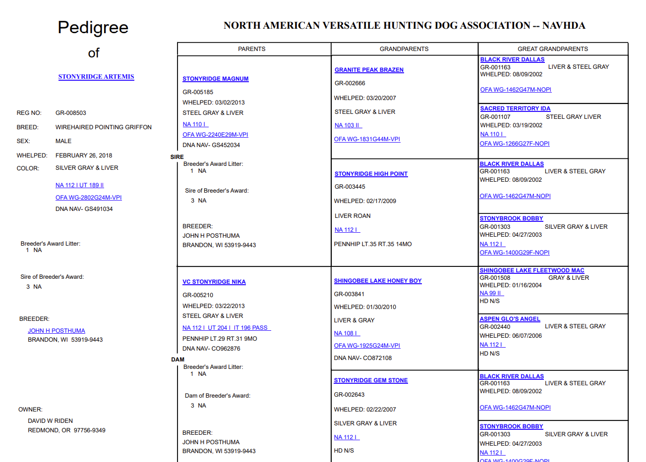 Riz weighs 52 lbs and stands 24”. Riz has completed his Navhda NA Test at the age 6.8 months with a Prize 1 112. He also completed his Navhda UT Test Prize 2 187. Riz is an acclaimed male hunting stud out of Ridenhigh Gun Dogs in Central Oregon.